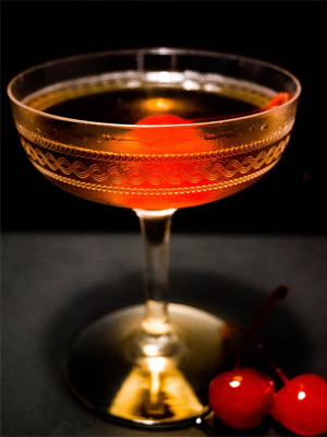 The Manhattan. This classic can go many ways. Traditionally a cocktail made with rye (and is best with rye), it is by most standards acceptable to use any bourbon or blended whiskey. The recipe calls for two parts whiskey, one part sweet vermouth, a dash or two of bitters, and a maraschino cherry garnish. Served chilled and straight up in a martini glass, but some prefer them on the rocks (the latter is ideal with one large ball of ice to maintain the integrity of flavor). While you may see bartenders shaking Manhattans, the more proper way is to stir briskly in one constant motion with a long-handled spoon, then strained into the glass.